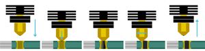 The heart of the printegrated circuits approach though is prinjection. Unlike traditional print pause print workflows, with Printegrated Circuits, we have to add custom movements to the print to create reliable connections between the Conductive materials and PCB. without this step traces do not adhere to the surface and good contact isn’t made.